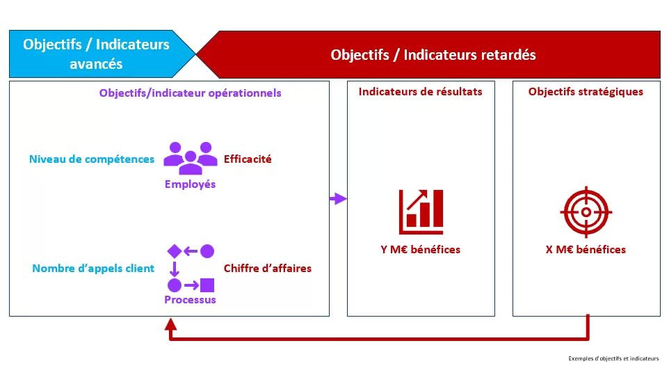 En somme, les indicateurs avancés sont des indicateurs de moyens qui permettent d'atteindre les objectifs mesurés par des indicateurs retardés qui sont des indicateurs de résultat. Ils fonctionnent en tandem pour offrir une vision complète des performances, permettant à l'entreprise d'anticiper les tendances et de réagir aux résultats obtenus.